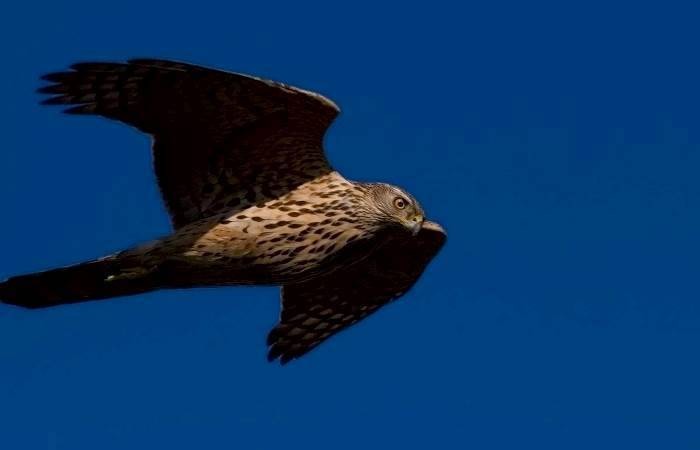 I parringsflugt lægger man altid mærke til de hvide underhaledækfjer, som ofte er pustet godt op. Flugten er tungere og mere kraftfuld end spurvehøgens.